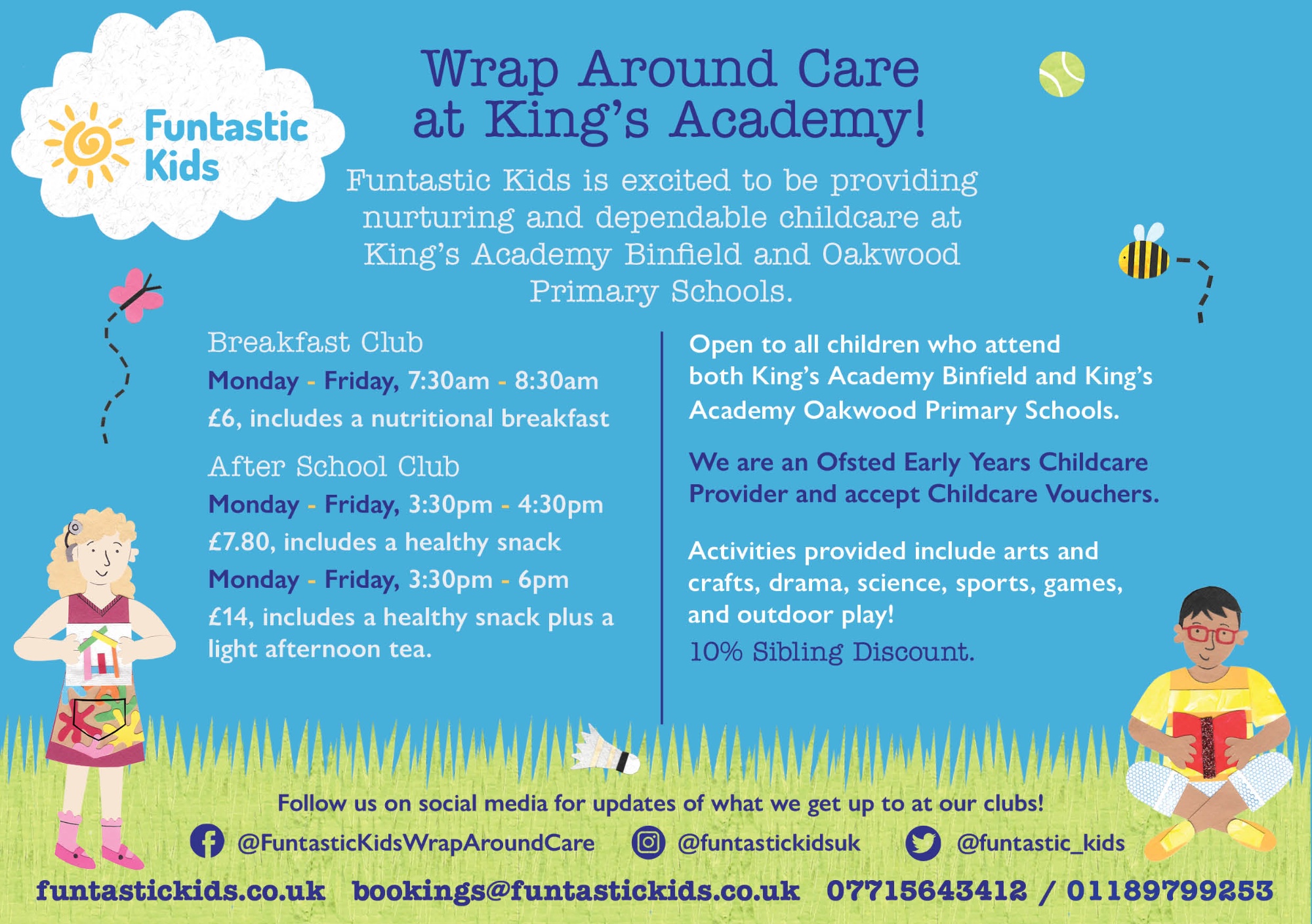 Funtastic Kids provide the Wrap Around Care at Kings Academy Binfield and Kings Academy Oakwood Primary schools or children attending the schools. The Binfield clubs take from 3 years old.