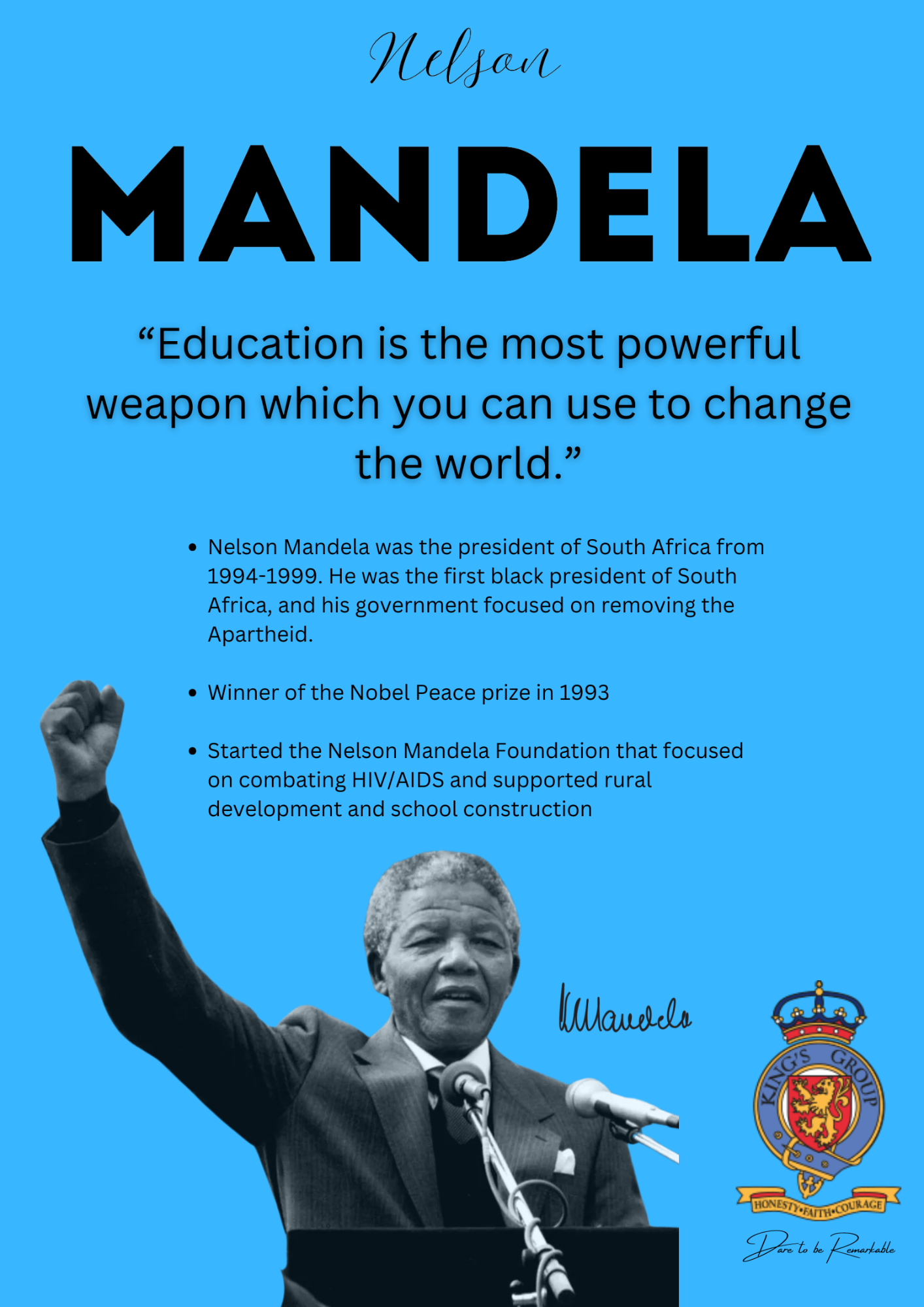 Nelson Rolihlahla Mandela (18 July 1918 – 5 December 2013) was a South African anti-apartheid revolutionary, political leader, and philanthropist who served as President of South Africa from 1994 to 1999.
